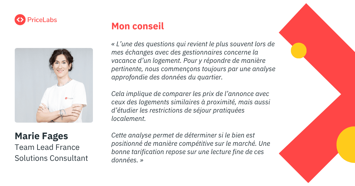 Taux d’occupation moyen | Pourcentage de nuits réservées dans les annonces comparables sur une période donnée. | Indique la demande dans le quartier et permet d’ajuster ses prix en conséquence. |