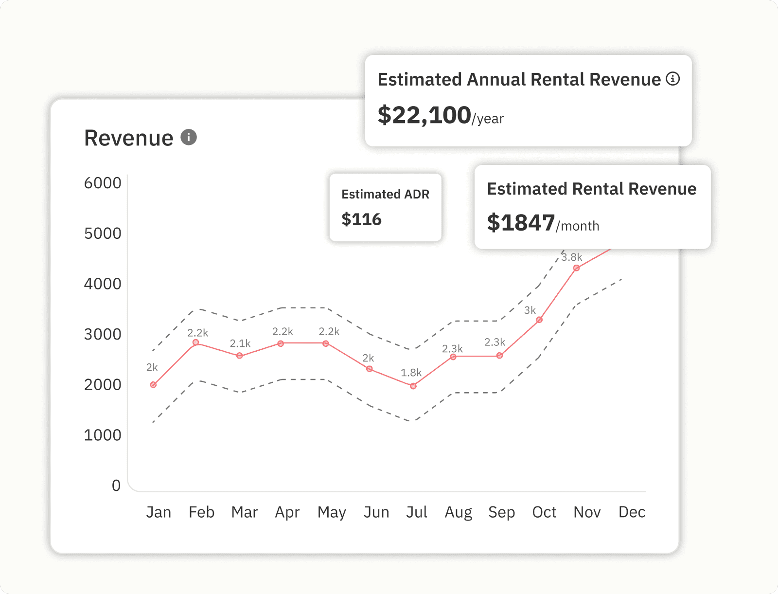 Understand how much a property can realistically earn as a short-term rental — with clear projections for revenue, nightly rates, and occupancy, anywhere in the world.